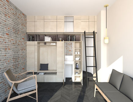 Aménagement d’un cabinet de psychothérapie de 18 m². L’astuce consiste à intégrer dans cet espace restreint un meuble cloison multi-fonctionnel : Il contient à la fois de nombreux rangements, fait office de kitchenette, d’assise pour le patient , de lave-main pour les toilettes avec une percée vitrée pour exploiter la lumière naturelle. Tous les matériaux bruts sont à l’honneur que ce soit la pierre et la brique pour les parois, le bois du sol et du meuble réalisé.